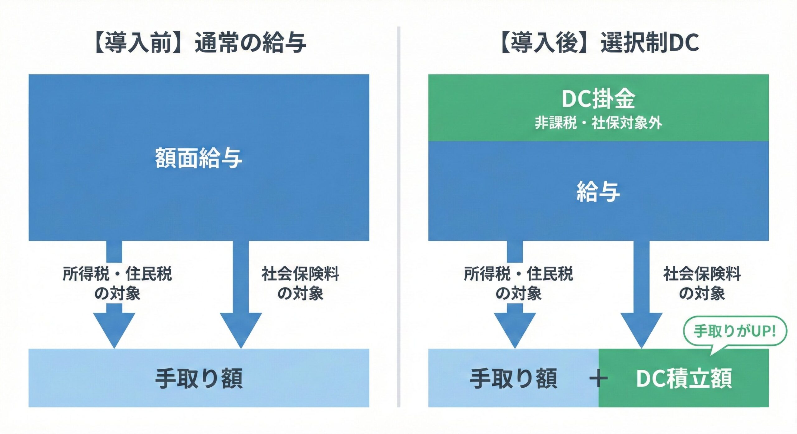 選択制DCの掛金分は、社会保険料(健康保険・厚生年金保険)の算定基礎となる「標準報酬月額」の対象外となります。